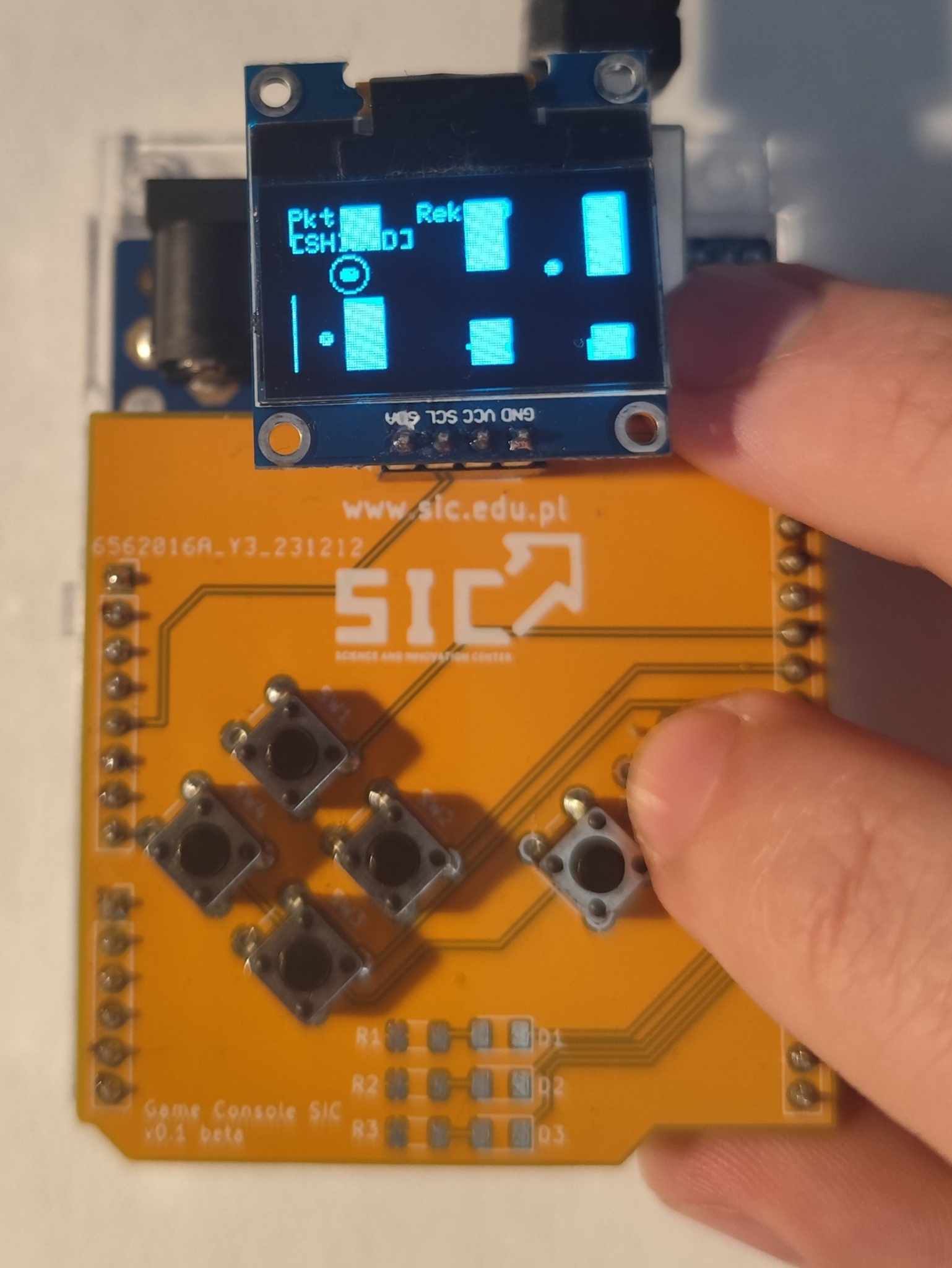Projekt polega na stworzeniu prostej gry zręcznościowej inspirowanej klasyczną grą Flappy Bird, działającej na mikrokontrolerze Arduino z wykorzystaniem wyświetlacza OLED. Gracz steruje ptakiem, który stale opada pod wpływem grawitacji, wykonując skoki przyciskiem w celu unikania przeszkód w postaci rur. Przejście przez każdą parę rur zwiększa wynik, a dodatkowe punkty można zdobywać zbierając monety pojawiające się między rurami. Niektóre monety, poza punktami, tymczasowo spowalniają tempo gry, chronią gracza przed uderzeniem, bądź sprawiają, że punkty mnożone przez dwa, ale przez swoje usytuowanie mogą zwiększać ryzyko porażki. Wraz ze wzrostem wyniku gra automatycznie zwiększa trudność, poprzez przyspieszenie przesuwania się rur, zmniejszenie odstępów oraz skrócenie czasu między pojawieniem się kolejnych przeszkód. Przed rozpoczęciem rozgrywki gracz ma możliwość wyboru jednego z trzech poziomów trudności (łatwy, średni lub trudny) za pomocą dodatkowych przycisków, co wpływa na parametry startowe gry, takie jak prędkość czy wielkość szczelin. Gra zapisuje również rekord punktowy w pamięci EEPROM, co pozwala na jego zachowanie po ponownym uruchomieniu urządzenia. Projekt został zrealizowany z pomocą sztucznej inteligencji. Autorzy: MIkołaj Czerniec, Patryk Dąbrowski