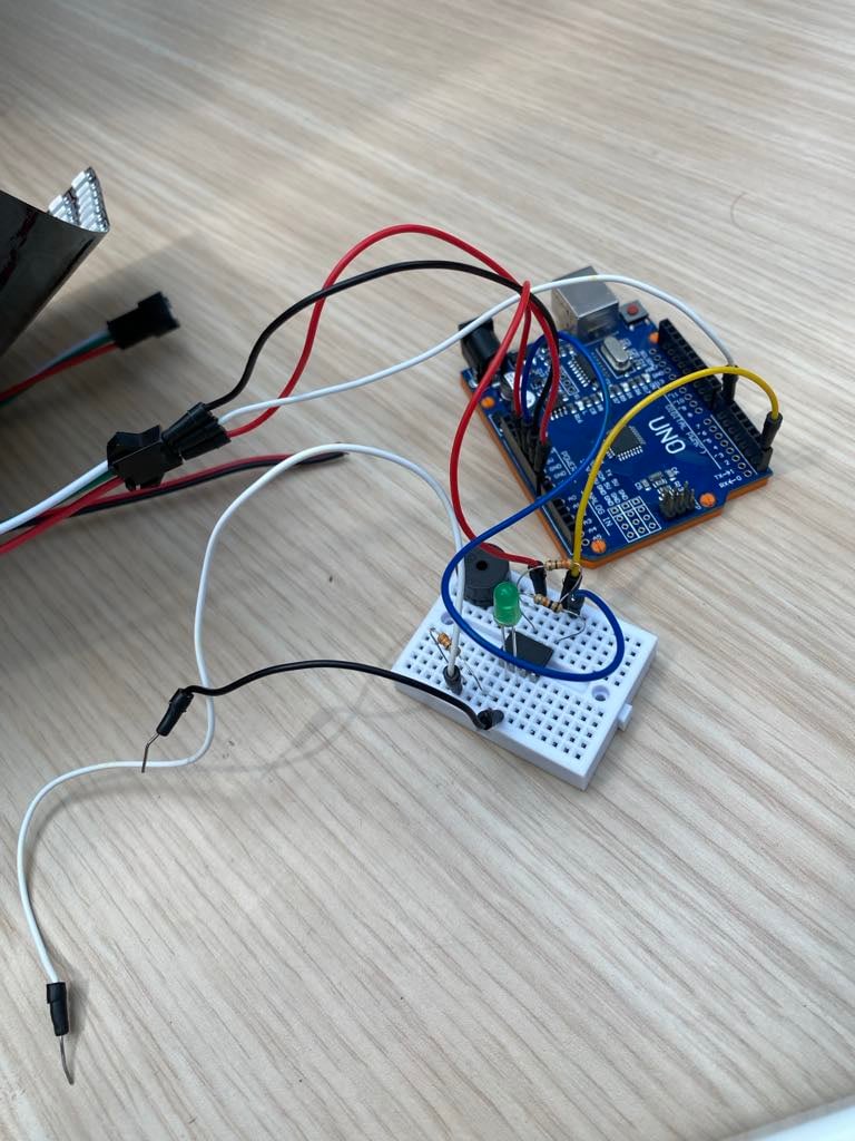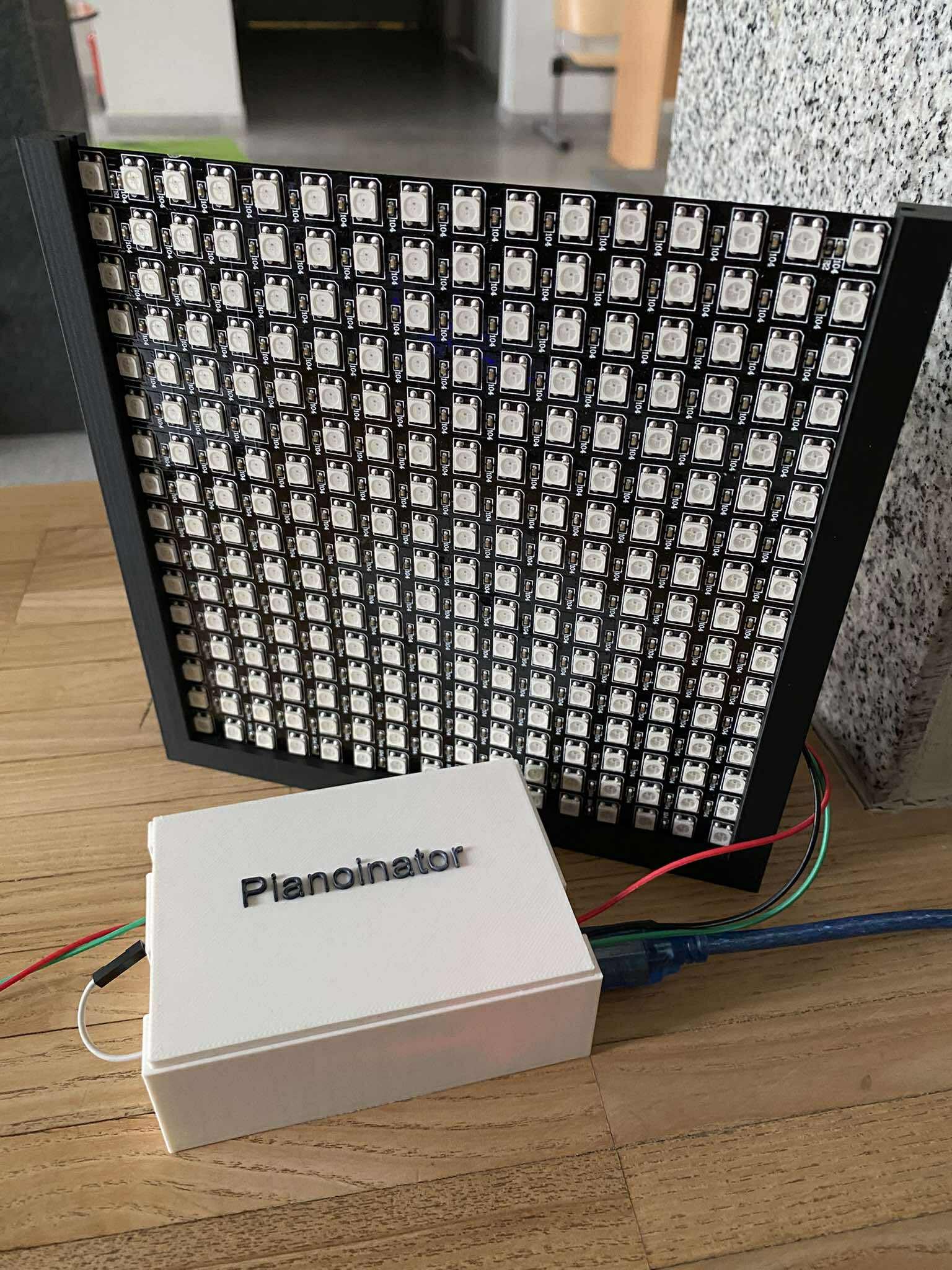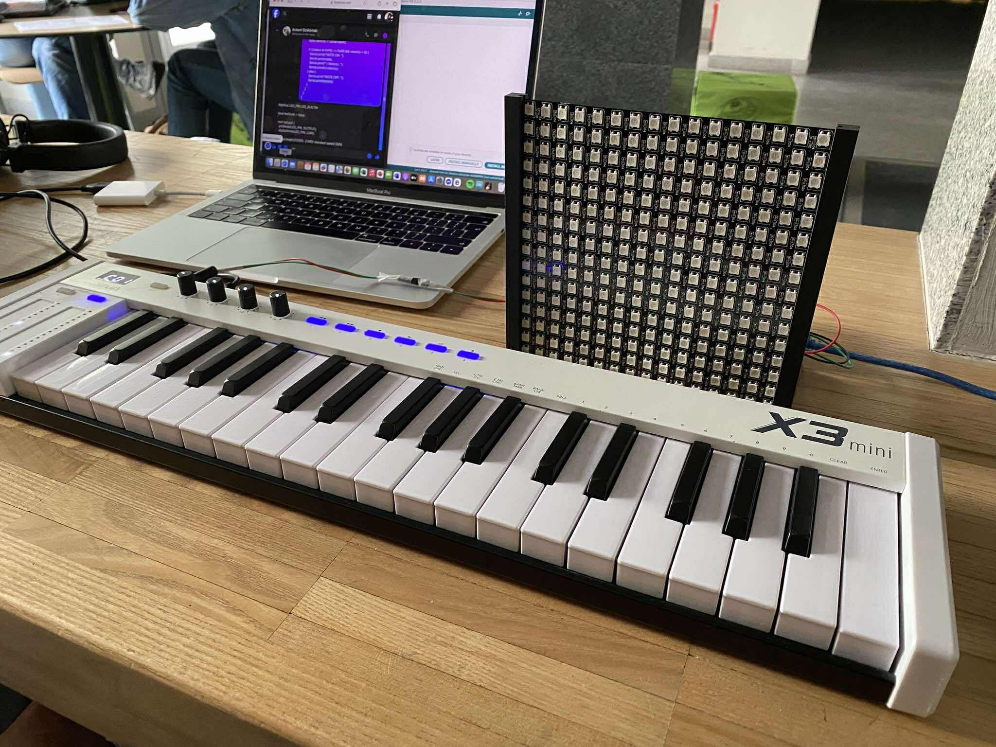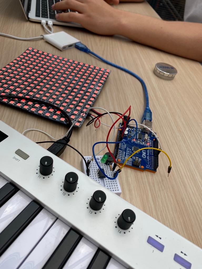 Projekt stanowi interaktywny system edukacyjny do nauki gry na klawiaturze MIDI, zbudowany z kilku współpracujących ze sobą komponentów: klawiatury MIDI, komputera z oprogramowaniem, mikrokontrolera Arduino Uno oraz wyświetlacza LED o rozdzielczości 16 na 16 pikseli. Całość została połączona w spójny i w pełni działający system, który umożliwia wizualne przedstawienie naciśnięć klawiszy oraz wspomaga użytkownika w nauce konkretnych utworów muzycznych poprzez dynamiczne wskazówki wyświetlane na matrycy LED. Centralnym elementem logiki systemu jest mikrokontroler Arduino Uno, który pełni rolę łąćznika pomiędzy klawiaturą MIDI a wyświetlaczem LED. Na płytkę Arduino wgrano specjalnie przygotowany program, którego zadaniem jest odczytywanie danych z interfejsu MIDI, rozpoznawanie, który klawisz został wciśnięty. Dodatkowo Arduino kontroluje matrycę LED i wyświetla na niej odpowiednio paski 2x16. Pasek ten symbolizuje konkretne naciśnięcie – jego pozycja na matrycy odpowiada danemu klawiszowi, a jego pojawienie się sygnalizuje użytkownikowi konieczność naciśnięcia danego dźwięku. Wyświetlacz LED 16x16 pełni funkcję wizualnego interfejsu użytkownika. Dzięki niewielkim rozmiarom i kwadratowej rozdzielczości możliwe jest wyświetlanie prostych, ale czytelnych reprezentacji zdarzeń MIDI – w szczególności pionowych pasków symbolizujących klawisze lub dźwięki. Każde kolejne naciśnięcie na klawiaturze MIDI skutkuje pojawieniem się nowego paska na matrycy, co tworzy sekwencję wizualnych wskazówek. Dzięki temu użytkownik widzi, jakie dźwięki są grane i w jakiej kolejności, co ułatwia zrozumienie struktury utworu oraz ćwiczenie jego wykonania. Całość projektu została zaprojektowana w sposób umożliwiający intuicyjną obsługę, nawet dla osób początkujących. Użytkownik może rozpocząć naukę gry na klawiaturze, śledząc pojawiające się na matrycy LED paski, które pełnią rolę wizualnych nut. Program może także zawierać proste mechanizmy oceny poprawności – na przykład poprzez zmianę koloru paska po poprawnym naciśnięciu odpowiedniego klawisza()jest to natomiast kolejny krok w rozwoju naszego projektu, który planujemy zrealizować w przyszłości). Projekt ten stanowi prosty, ale skuteczny sposób nauki gry na instrumentach muzycznych z wykorzystaniem nowoczesnych technologii i wizualizacji.