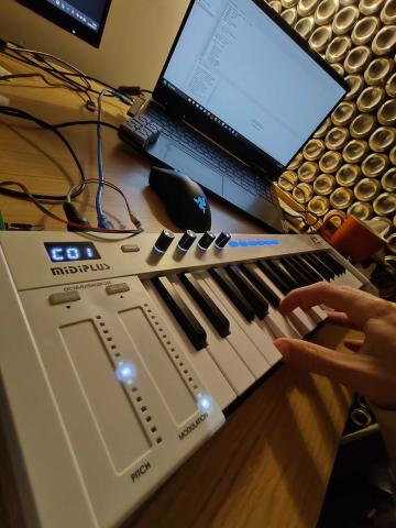 Projekt prezentuje budowę instrumentu muzycznego na bazie układu ESP32 w dwóch odsłonach: od prostego pianina na klawiaturze numerycznej, po zaawansowany syntezator sterowany przez MIDI. W głównej części zrealizowaliśmy obsługę polifonii oraz zaprogramowaliśmy efekty takie jak Robot, Synthwave i Flanger, zmieniające barwę w czasie rzeczywistym. Całość uzupełnia obsługa pokręteł, które pozwalają na płynne sterowanie efektami oraz regulację głośności instrumentu.