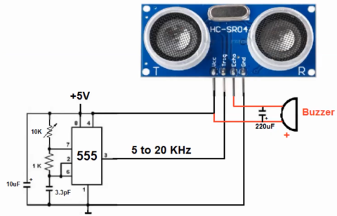 i wraca do odbiornika (R). Czujnik na wyjściu ECHO generuje impuls o szerokości proporcjonalnej do zmierzonej odległości (na zdjęciach poniżej pokazano zmierzone szerokości fal za pomocą oscyloskopu dla dwóch położeń przeszkody). Impuls ten trafia do brzęczyka piezoelektrycznego, który w zależności od częstotliwości fali wytwarza dźwięk o różnych tonach – im bliżej obiekt się znajduje, tym wyższy ton dźwięku. Do brzęczyka podłączamy równolegle kondensator elektrolityczny 220μF, który wygładza impulsy i poprawia jakość sygnału. Zmieniając wartość na potencjometrze, można regulować zakresem czułości czujnika odległości.