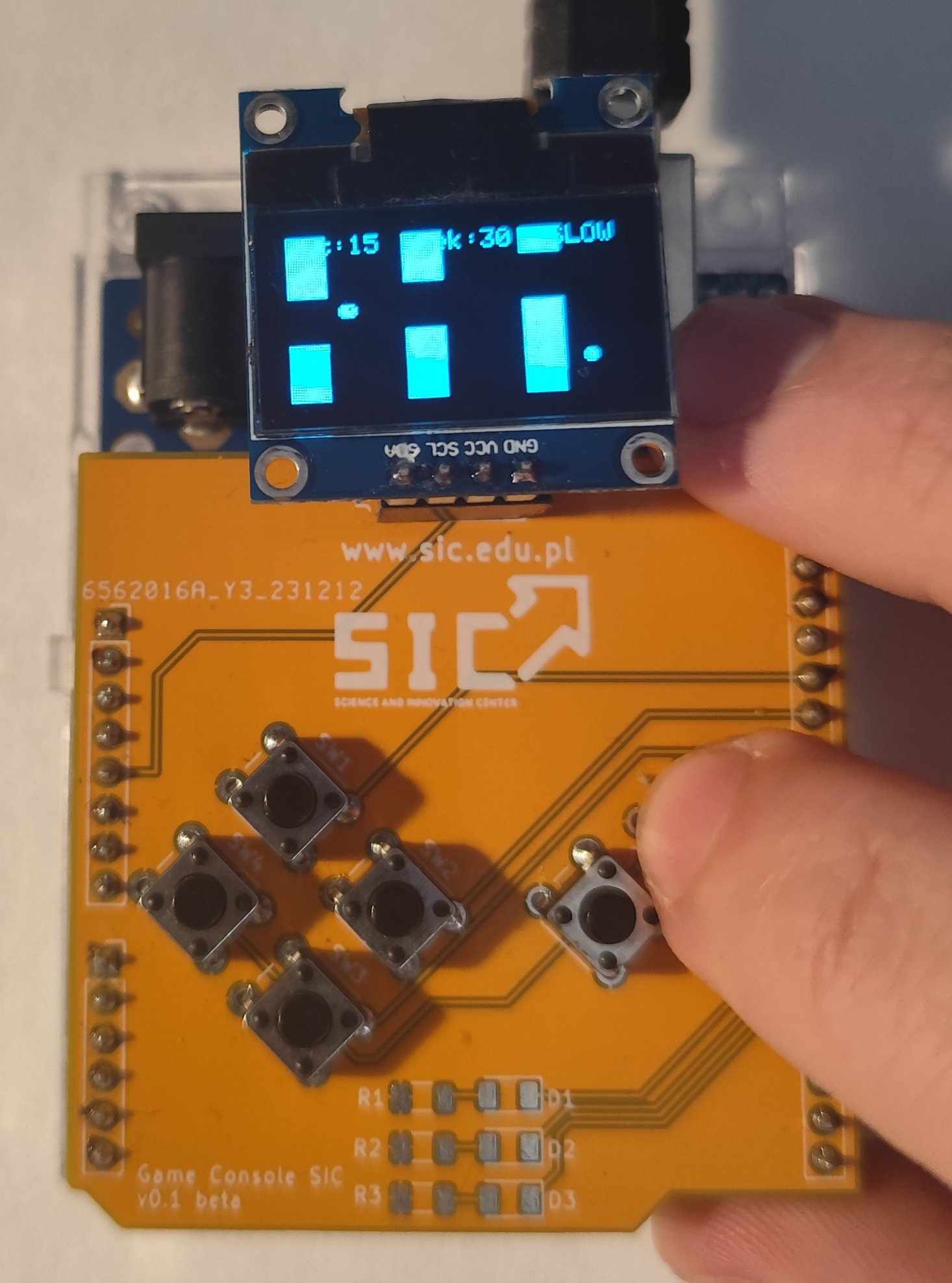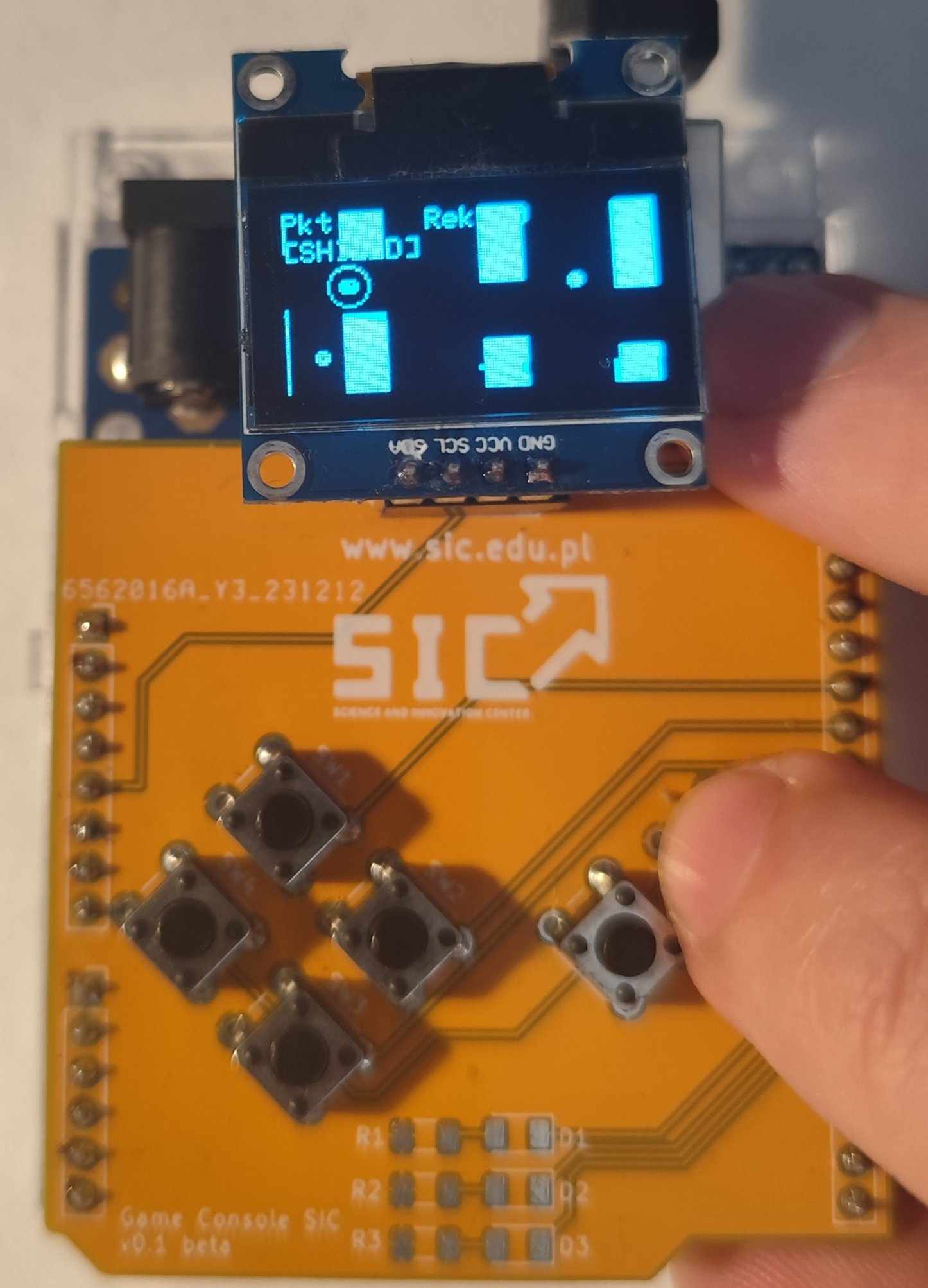 Projekt polega na stworzeniu prostej gry zręcznościowej inspirowanej klasyczną grą Flappy Bird, działającej na mikrokontrolerze Arduino z wykorzystaniem wyświetlacza OLED. Gracz steruje ptakiem, który stale opada pod wpływem grawitacji, wykonując skoki przyciskiem w celu unikania przeszkód w postaci rur. Przejście przez każdą parę rur zwiększa wynik, a dodatkowe punkty można zdobywać zbierając monety pojawiające się między rurami. Niektóre monety, poza punktami, tymczasowo spowalniają tempo gry, chronią gracza przed uderzeniem, bądź sprawiają, że punkty mnożone przez dwa, ale przez swoje usytuowanie mogą zwiększać ryzyko porażki. Wraz ze wzrostem wyniku gra automatycznie zwiększa trudność, poprzez przyspieszenie przesuwania się rur, zmniejszenie odstępów oraz skrócenie czasu między pojawieniem się kolejnych przeszkód. Przed rozpoczęciem rozgrywki gracz ma możliwość wyboru jednego z trzech poziomów trudności (łatwy, średni lub trudny) za pomocą dodatkowych przycisków, co wpływa na parametry startowe gry, takie jak prędkość czy wielkość szczelin. Gra zapisuje również rekord punktowy w pamięci EEPROM, co pozwala na jego zachowanie po ponownym uruchomieniu urządzenia. Projekt został zrealizowany z pomocą sztucznej inteligencji. Autorzy: MIkołaj Czerniec, Patryk Dąbrowski
