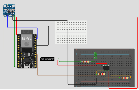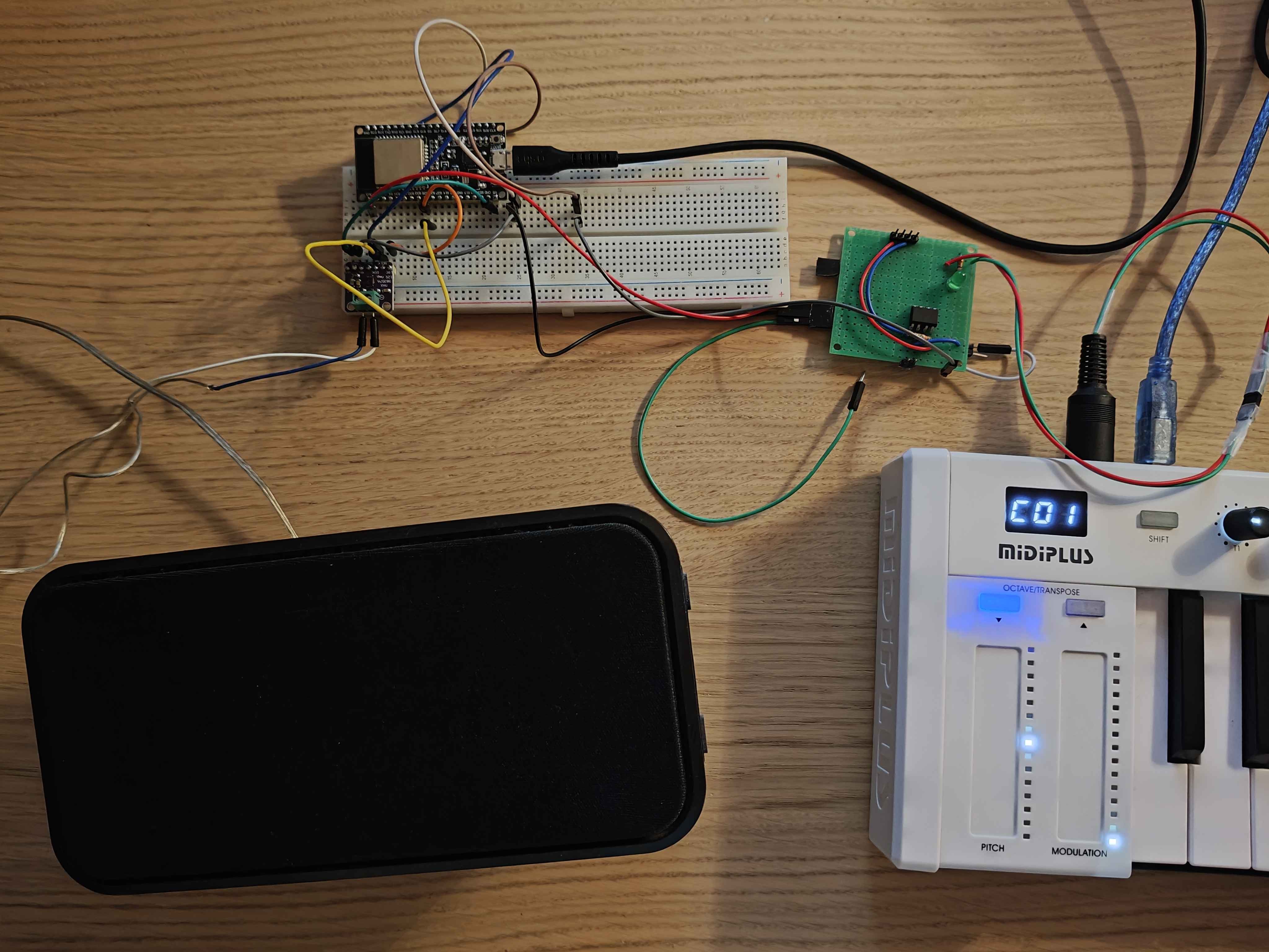 Projekt prezentuje budowę instrumentu muzycznego na bazie układu ESP32 w dwóch odsłonach: od prostego pianina na klawiaturze numerycznej, po zaawansowany syntezator sterowany przez MIDI. W głównej części zrealizowaliśmy obsługę polifonii oraz zaprogramowaliśmy efekty takie jak Robot, Synthwave i Flanger, zmieniające barwę w czasie rzeczywistym. Całość uzupełnia obsługa pokręteł, które pozwalają na płynne sterowanie efektami oraz regulację głośności instrumentu.