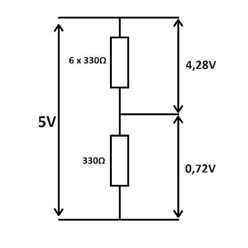 Dla jednakowych rezystorów podłączonych szeregowo spadek napięcia na każdym jest identyczny (żeby uzyskać wartość należy podzielić napięcie wejściowe czyli 5V przez ich ilość), wyjście podłączamy w miejscu gdzie napięcie spadło do bezpiecznego poziomu i łączymy z pinem o numerze 34.
